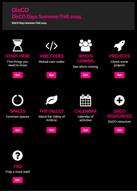 Not a conference, not a vacation, but a relaxed residency where you bring your own rhythm: decide when to arrive, stay as long as you like (1 week minimum), and mix work, play, and connection. Your minimum scheduling commitment is the twice-weekly, half-day afternoon meetings with all attendees and the DisCO team. There are also multiple working groups, orientation sessions, workshops, live music, a full program that will adapt as we go, mixing meaningful social and environmental time.